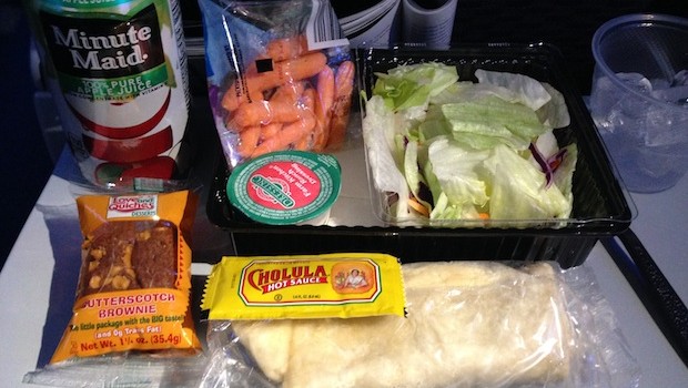 THE SERVICE: There was a charge of $7.99 for using the entertainment system, which featured TV and movie programming, but the headsets were free. I was pleasantly surprised to find that a small but hot meal was served for free in economy class: the choice was a cheeseburger or a chicken wrap, with a small side salad, bag of carrots and Love and Quiches brand butterscotch brownie.