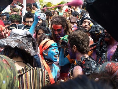 The procession made its slow way forward, snaking the streets and congregating in the occasional squares and plazas. From time to time, residents (from the safety of their barred windows) would point a hose into the crowd, just to keep them on their toes. Youngsters on rooftops emptied buckets of water onto the passing heads below. But despite the almost complete destruction of their otherwise pleasant tranquility, the neighbors didn’t seem to mind – in fact, most of them were probably in the ruckus somewhere, paint bucket in hand.