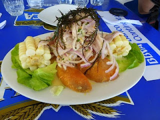 2. Ceviche. Perhaps the most famous Peruvian dish, ceviche is a popular plate in Lima and along the coast. The dish consists of raw white fish marinated in lime juice and seasoned with red onion and aji, and typically served alongside choclo (large kernelled corn) and camote (sweet potato).