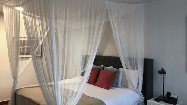 HOTEL ROOMS: We stayed in room 415, an amply sized accommodation where the king-sized bed immediately attracts attention, with its dramatic mosquito netting and multicolored pillows. The décor was equally pleasing in the room, with contemporary photography (the artsy kind that makes you wonder where it’s from) and an attractive chair and lamp. Additional noteworthy features include an empty mini-fridge (which we love, since you can fill it with whatever you want, rather than being overcharged for what a hotel thinks you need). Two packets of coffee are included for free every day; any additional packages cost $3. The flatscreen, wall-mounted television featured various streaming services. We paid a bit more to upgrade to this room, so that we could also have a balcony that overlooked the street. The bathroom was small and not as stylish, but clean and serviceable, with a sink and closet area separate from the toilet and shower.